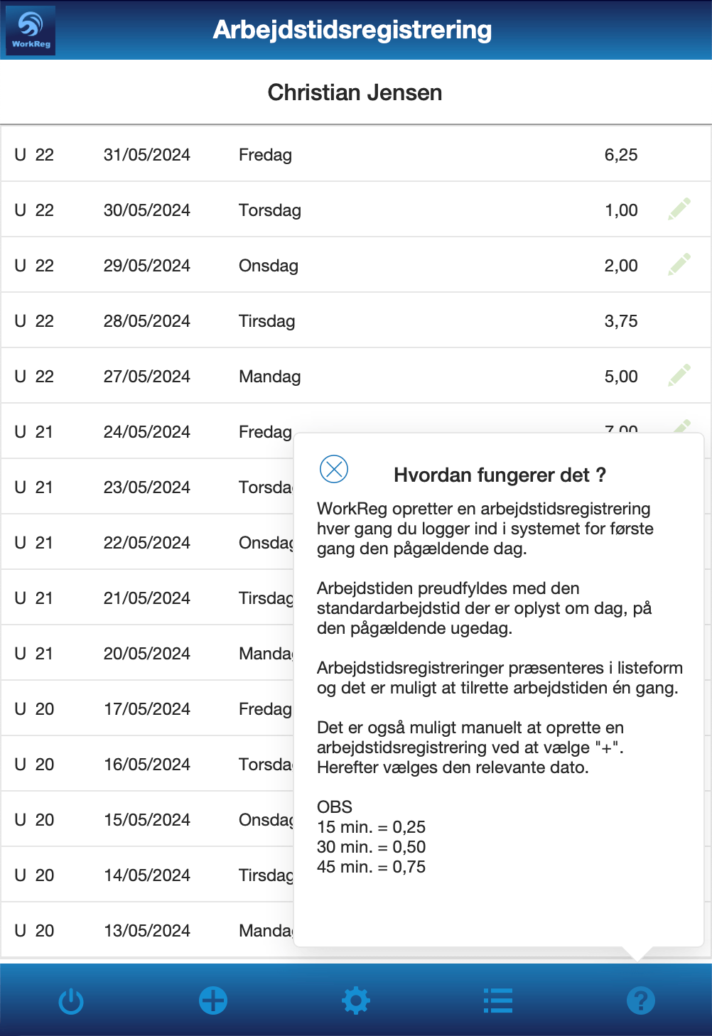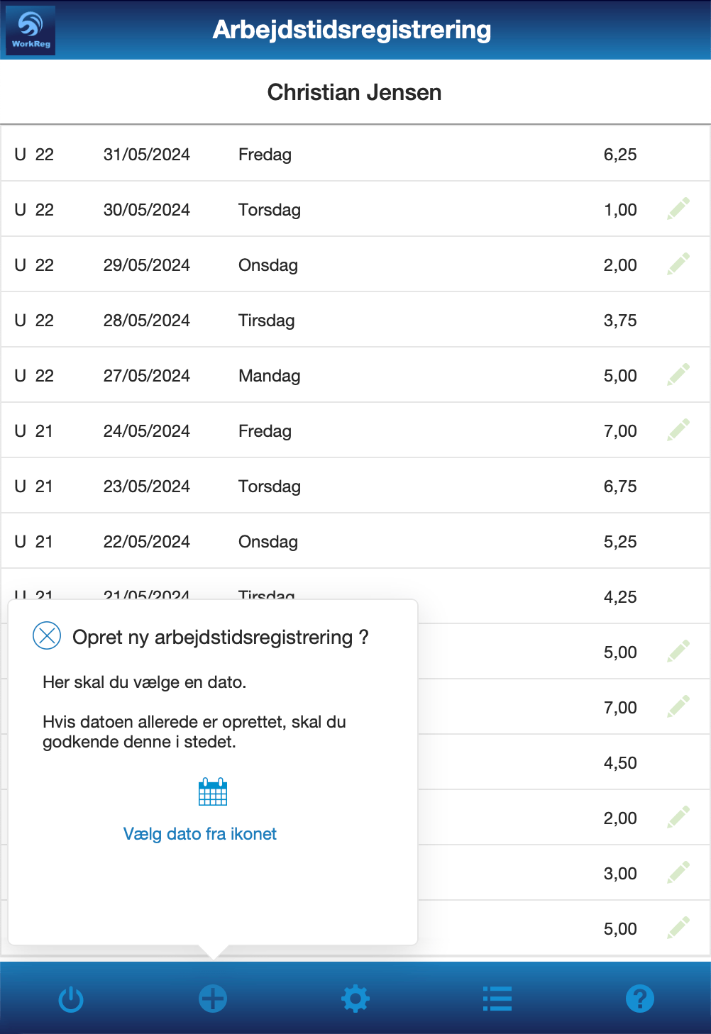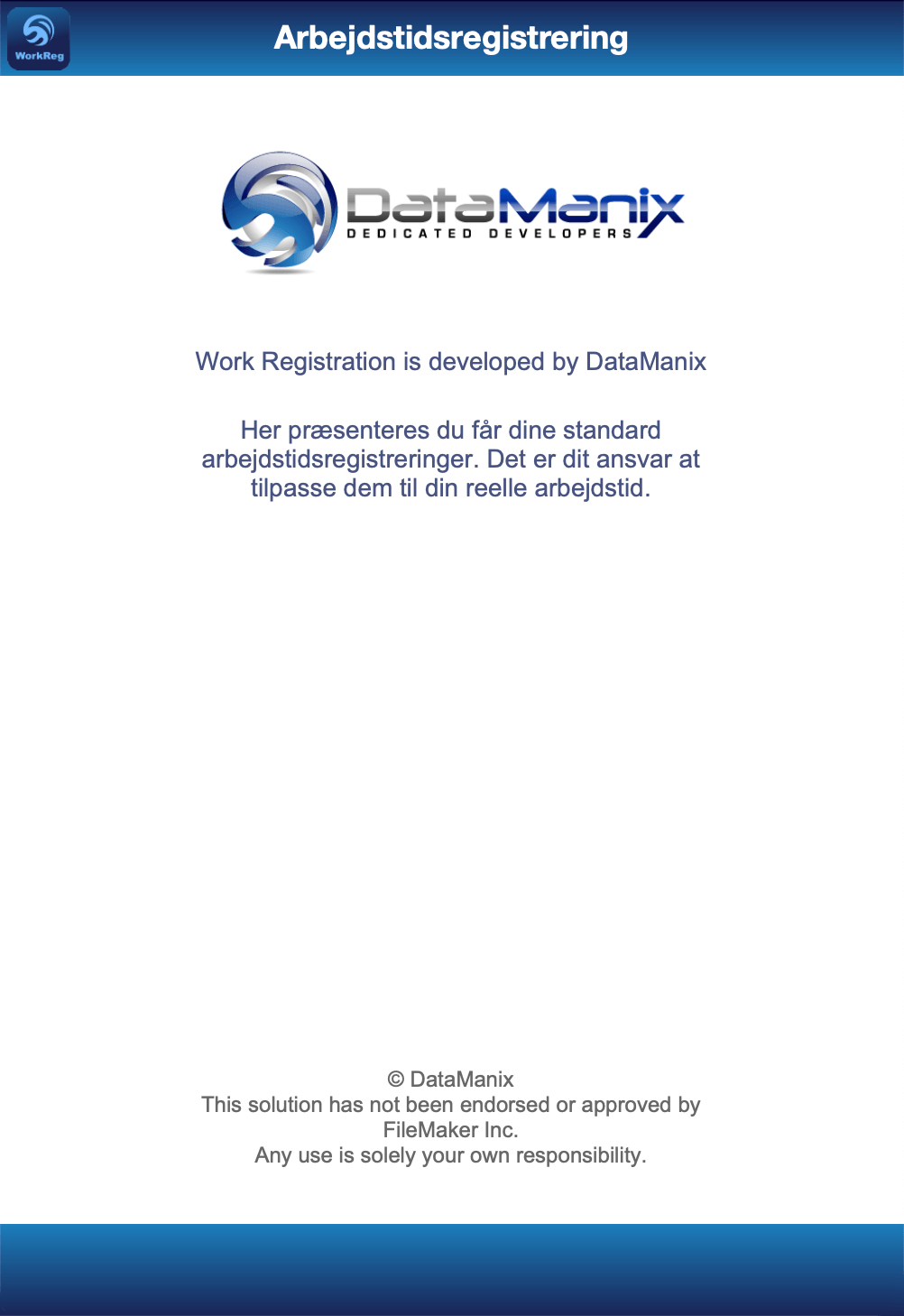 DM WorkReg opretter automatisk en arbejdstidsregistrering, når medarbejderen åbner jeres FileMaker system, og indsætter normal arbejdstid for den pågældende dag. Arbejder medarbejderen anderledes end normalt, kan vedkommende klikke på en knap i jeres dashboard som åbner et vindue hvor arbejdstiden kan rettes til manuelt.